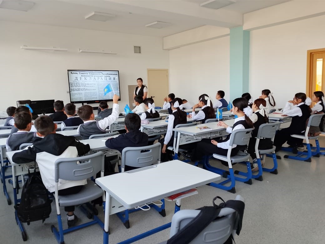 Сынып жетекшісі оқушыларға Республика күнінің мәні мен тарихын түсіндіріп, бұл мерекенің еліміздің тәуелсіздігі мен егемендігінің бастауы екенін атап өтті. Сабақ барысында ұстаз 1990 жылдың 25 қазанында қабылданған «Қазақстан Республикасының мемлекеттік егемендігі туралы декларацияның» ел дамуындағы тарихи рөліне ерекше тоқталды. Бұл құжат тәуелсіз Қазақстанның іргетасы болған аса маңызды тарихи шешім екені айтылды.